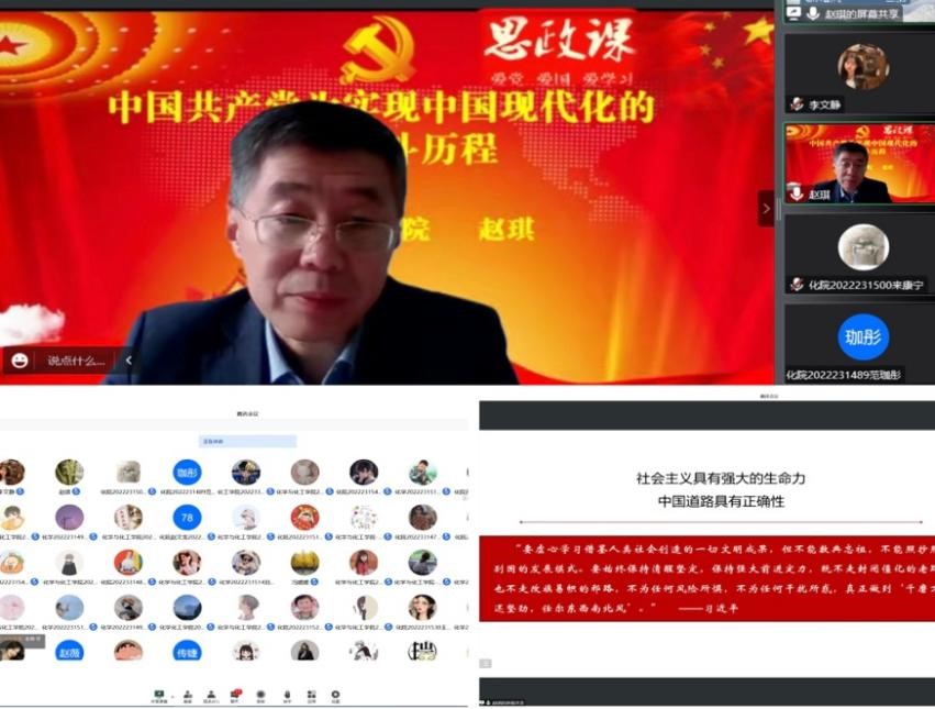 赵琪书记围绕中国共产党为实现中国现代化的百年奋斗历程,从“敢问路在何方、不走‘老路’和‘邪路’、走有中国特色的‘新路’”三个方面对党的百年奋斗历程展开详细讲述,深度剖析了中国现代化建设道路深厚的历史逻辑、深刻的理论逻辑和生动的实践逻辑。赵琪书记表示希望同学们进一步坚定政治信仰,加强政治学习,并将其转化为努力学习的动力源泉,为加快我国社会主义现代化建设、实现中华民族伟大复兴不懈奋斗。