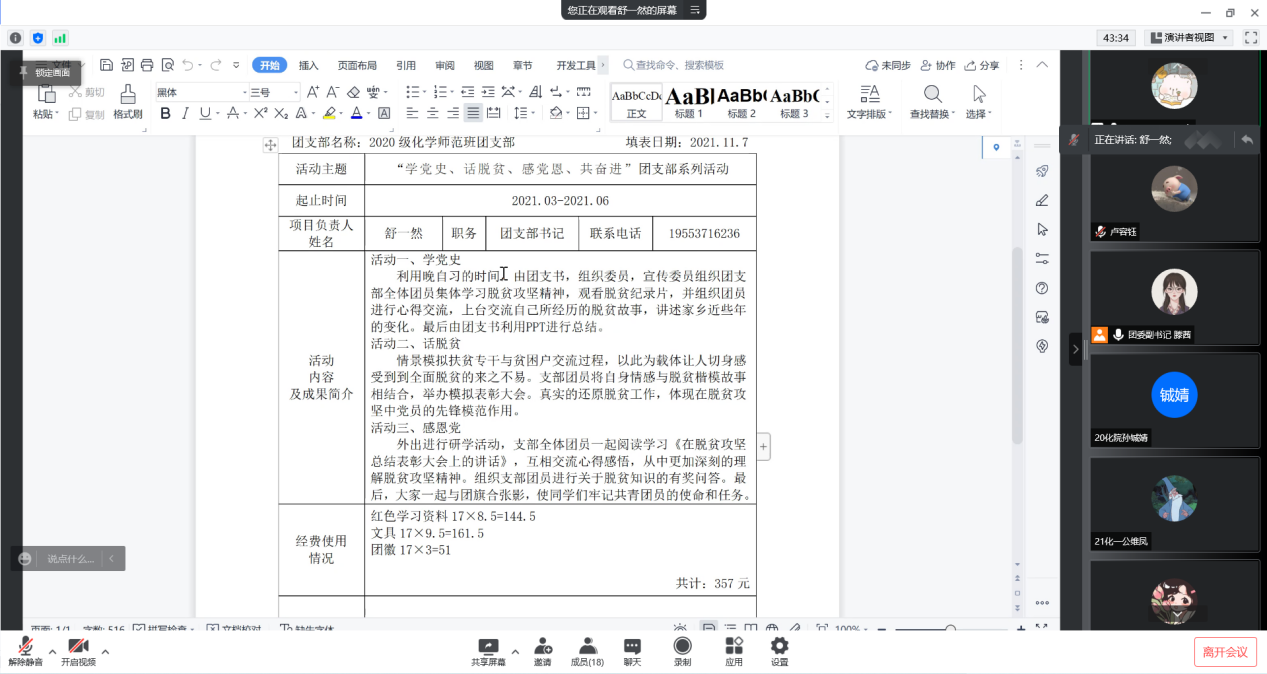 严格遵守疫情防控安排,成功举办线上团干部会议。会议由学院团委副书记滕茜主持,学院团委书记王亚平,2020级、2021级全体团支书参与本次会议。