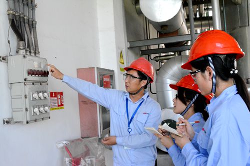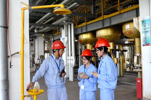 712日,全体实践队员深入360车间(中间体生产车间),观察塔式连续反应装置和釜式间断反应装置以及燃气体报警系统、有毒有害气体报警系统、安全应急指示灯、紧急停车系统(ESD)、紧急喷淋洗眼器、常闭式防火门等设施。“以人为本,安全第一”的理念在360车间得到了充分的体现。