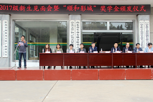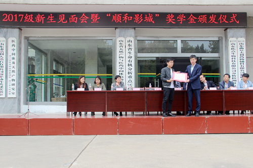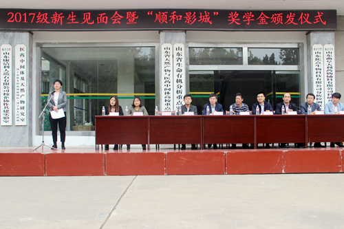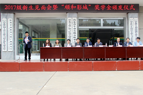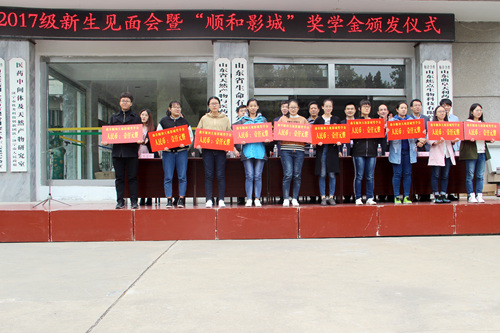 2017级新生见面会暨“顺和影城”奖学金颁发仪式在院楼前广场隆重举行。院长尤进茂、党委书记赵琪、党委副书记孙俊华、曲阜顺和影城总经理李正超、团委书记胡乃永、办公室主任陈光、教学秘书胡蕾、教师代表齐伟、辅导员张乾坤、王亚平出席大会。会议由胡乃永主持。